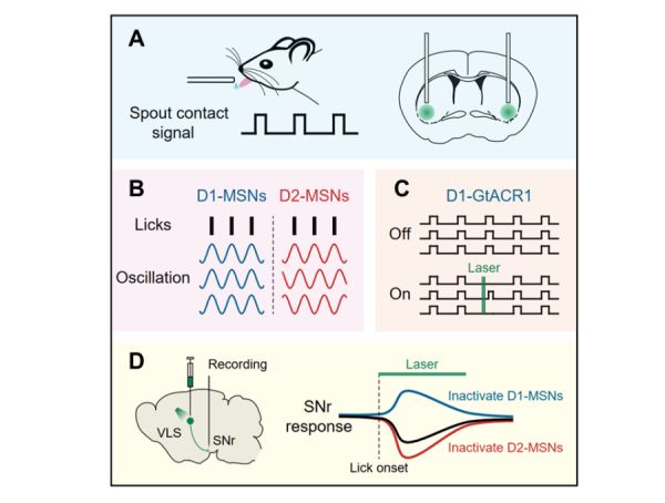 研究团队发现,在秒级时间尺度上抑制VLS使得舔水序列内的舔水数目减少,舔水率下降,但是不改变舔水节律。抑制D1-MSNs能够降低舔水率,而抑制D2-MSNs能够增加舔水率。通过在VLS进行光遗传标记记录,发现绝大多数D1-MSNs与D2-MSNs的活动与舔水行为相关,但二者在舔水序列的起始与执行阶段表现出活动的差异。在单个舔水周期的百毫秒级时间尺度上,D1-MSNs与D2-MSNs的舔水触发振荡活动的相位具有明显差异。D1-MSNs的舔水触发活动在鼠舌触碰到出水口的时刻达到峰值,与D2-MSNs的活动模式不同。在单个舔水周期的伸舌阶段瞬时抑制D1-MSNs能够降低该次舔水动作发生的概率,而瞬时抑制D2-MSNs对舔水行为没有影响。在光遗传操纵的同时进行电生理记录的实验发现,在抑制VLS的D1-MSNs和抑制VLS的D2-MSNs这两种情况下,反应类型为抑制型或持续型的SNr神经元的活动均呈现相反的变化。